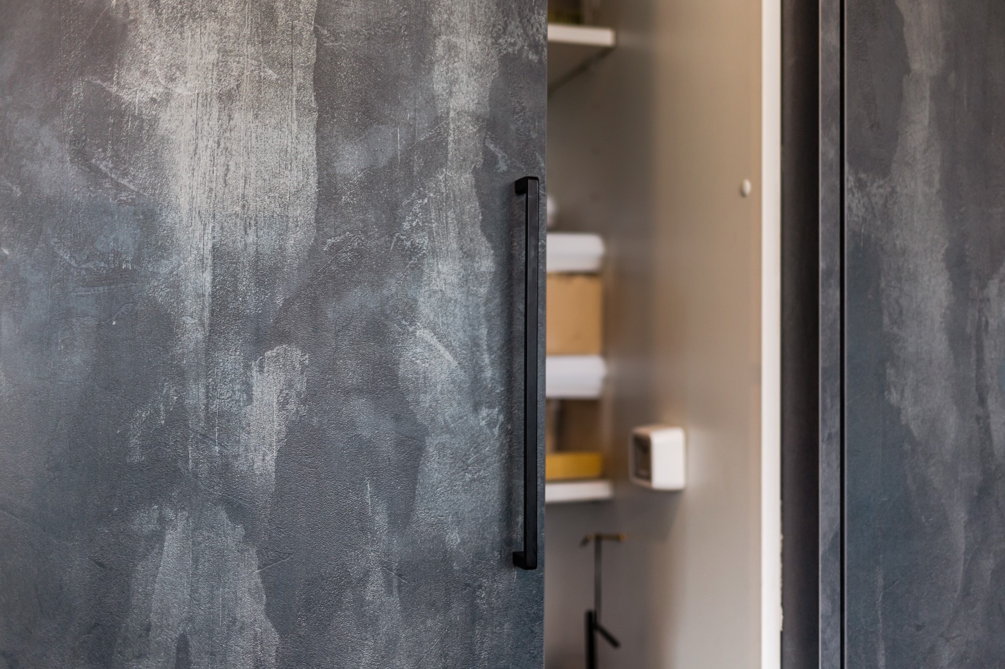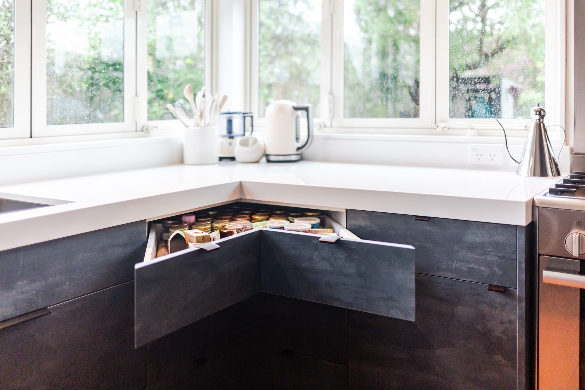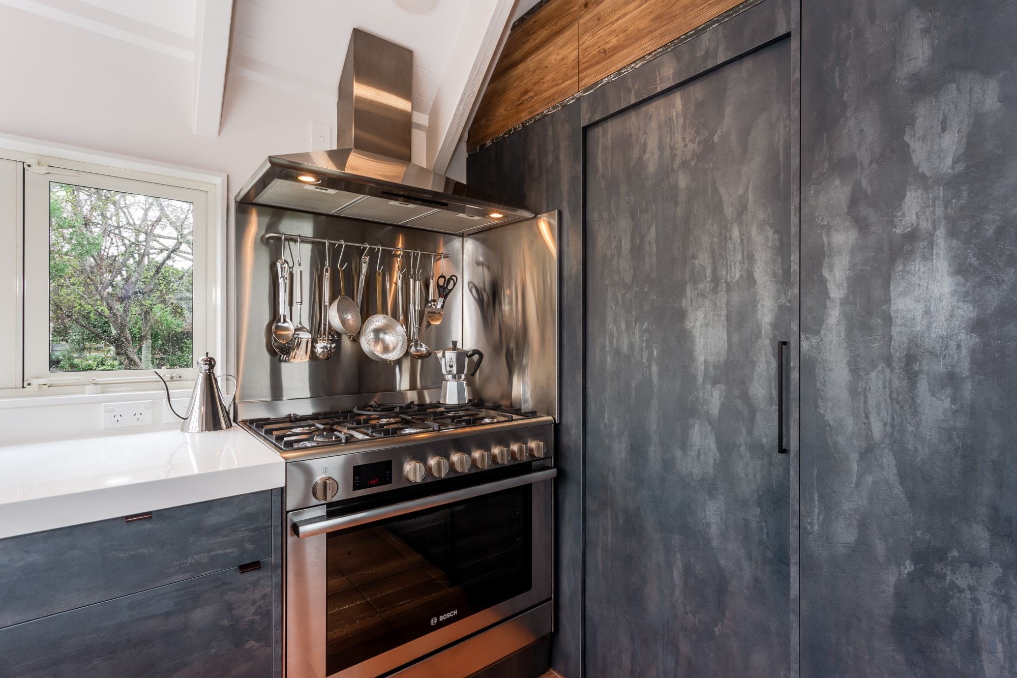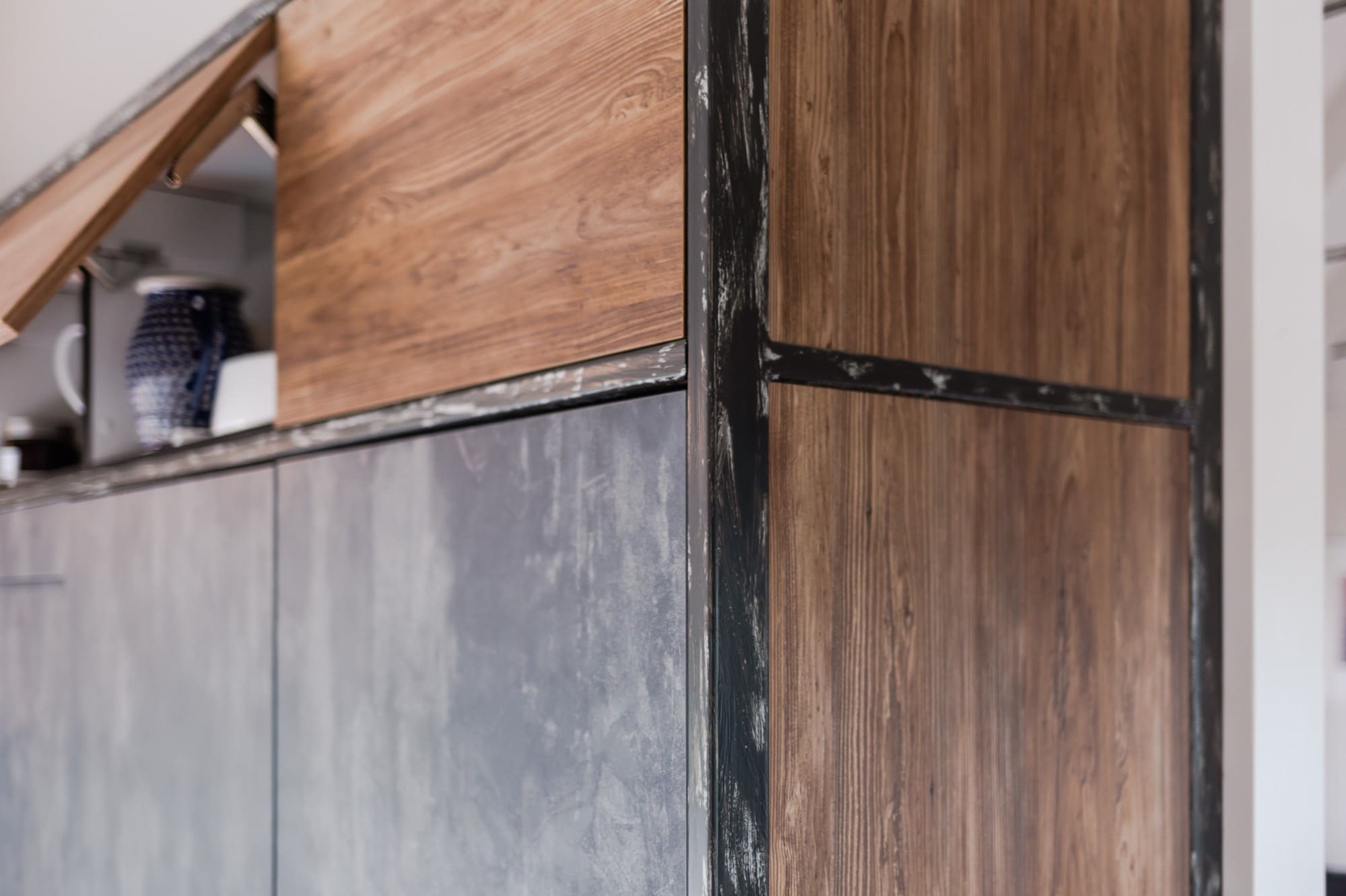 The bespoke kitchen has been crafted from brushed paint panels, with steel framing to give a dramatic finish and match the existing features of the house.