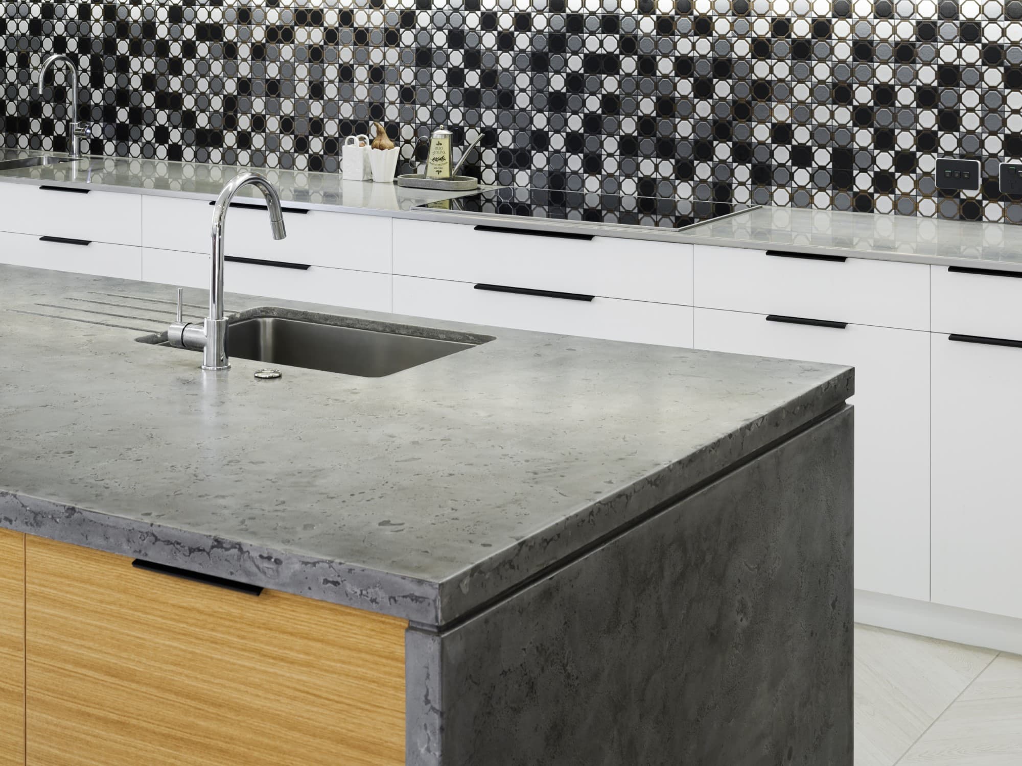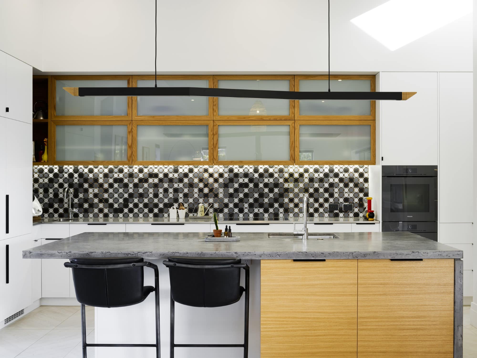 This custom build kitchen has solid oak timber cabinetry with a mix of stainless steel and concrete benchtops, complemented by a fully integrated fridge and freezer.