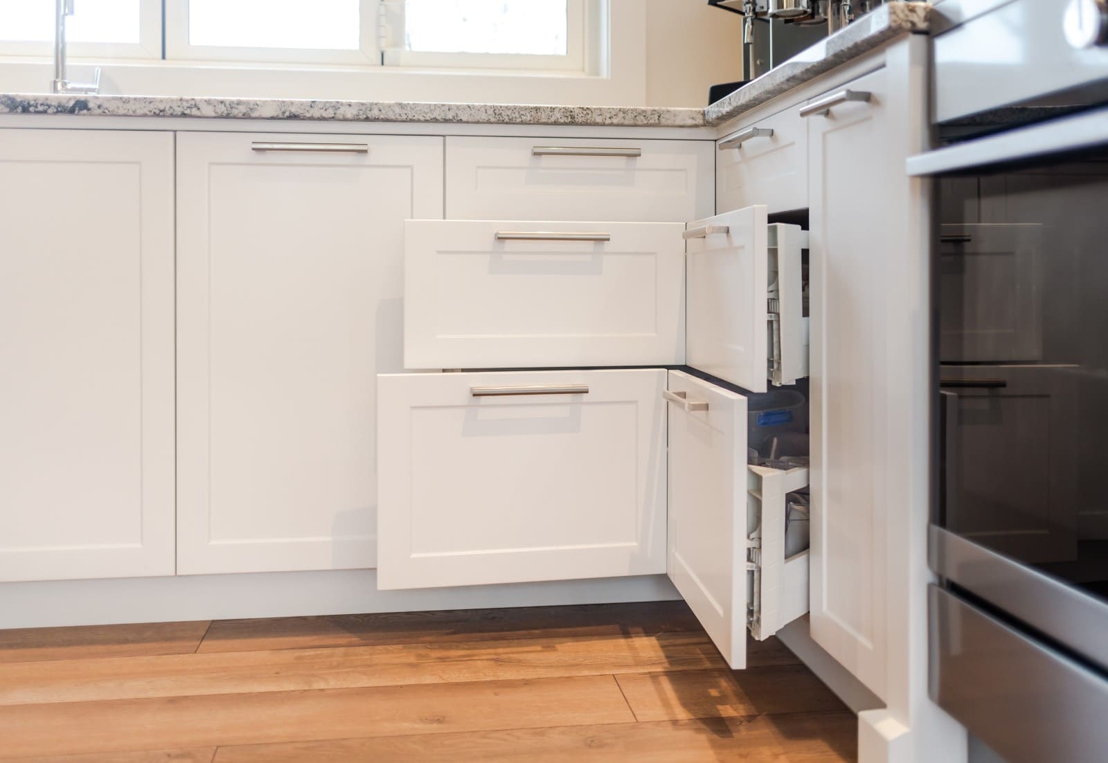 The Atlantic white granite, double bifold pantry, corner drawers for better storage, and thermoform cabinetry fronts really set this kitchen apart.