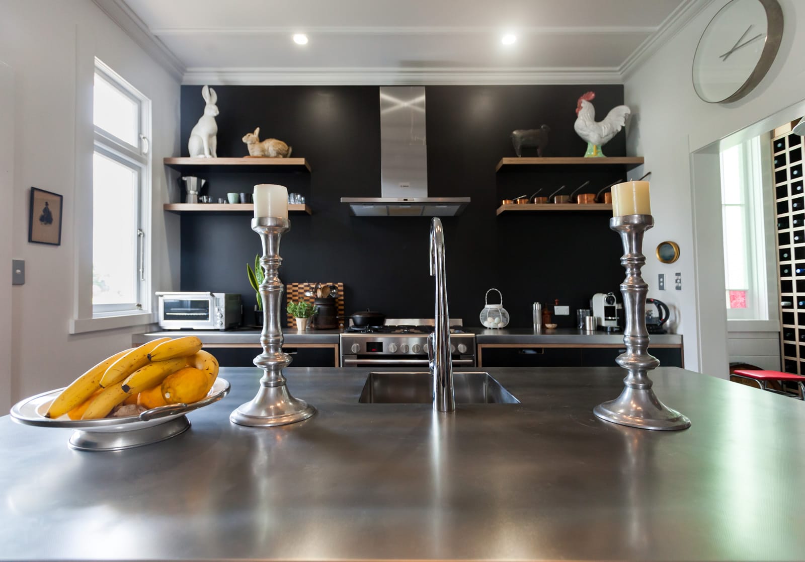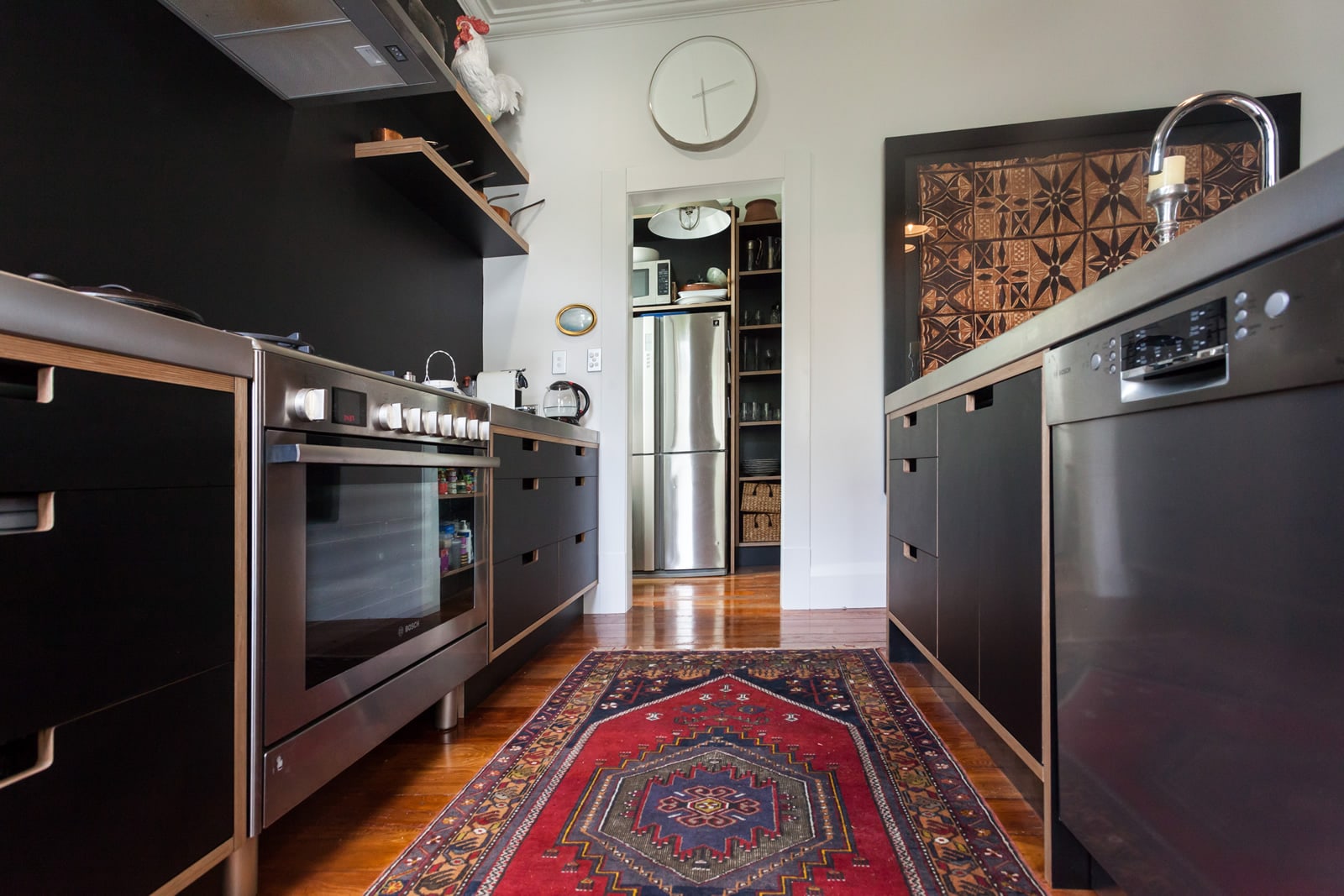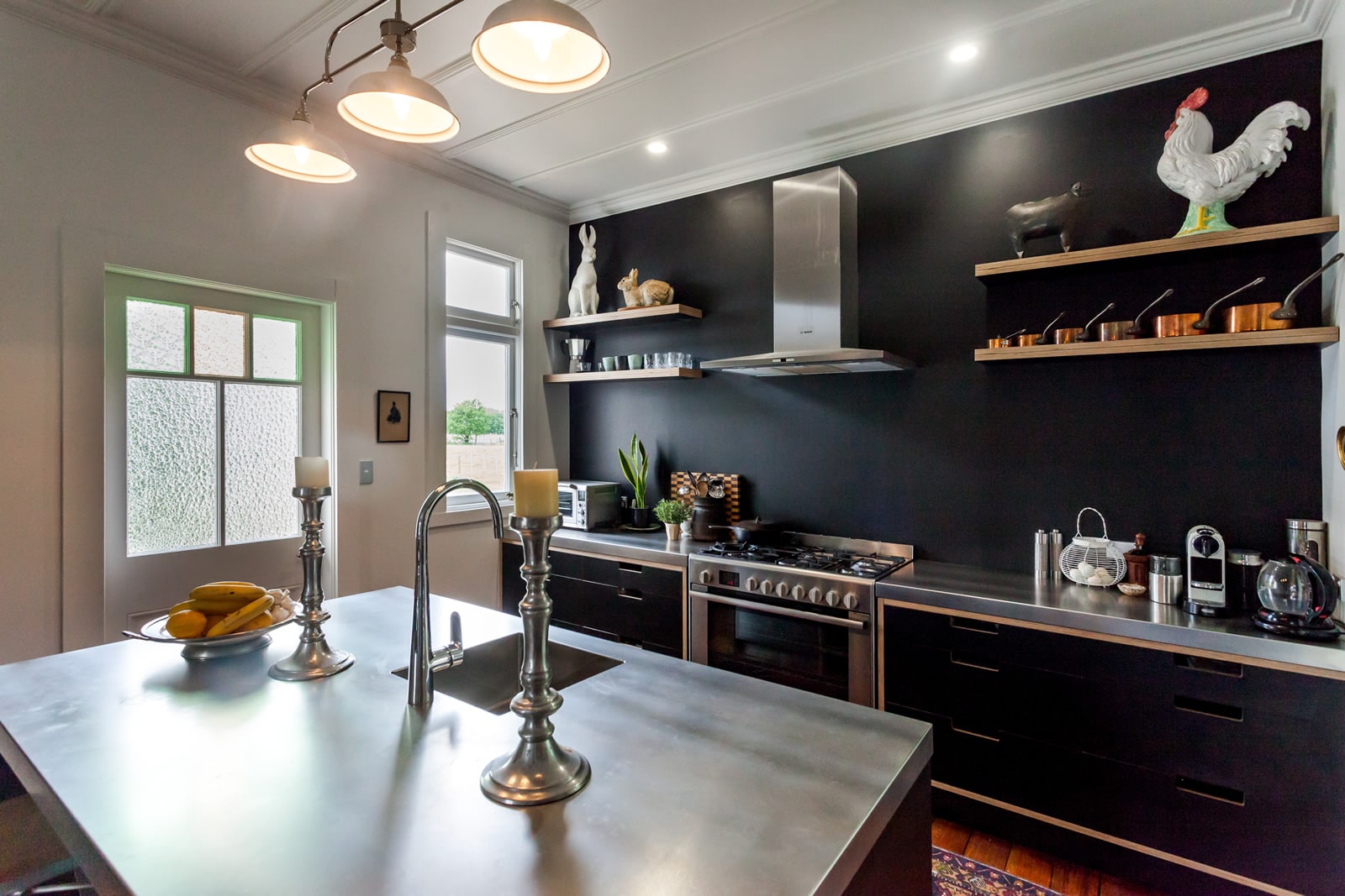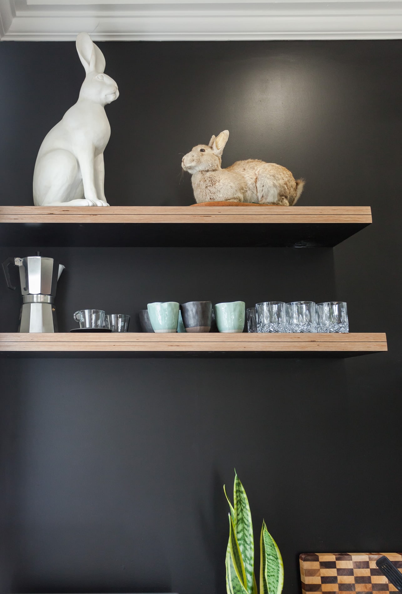 Simple birch plywood shelving really pops against the painted black splashback allowing Marcus to display some of his beautiful prized possessions.