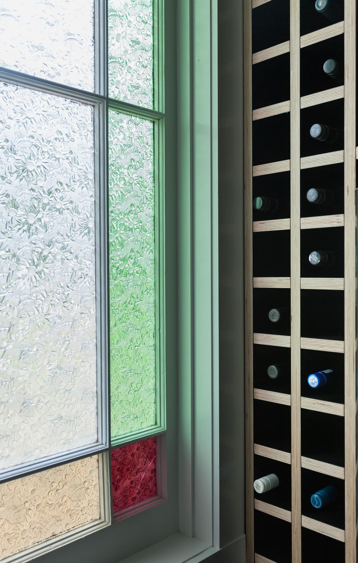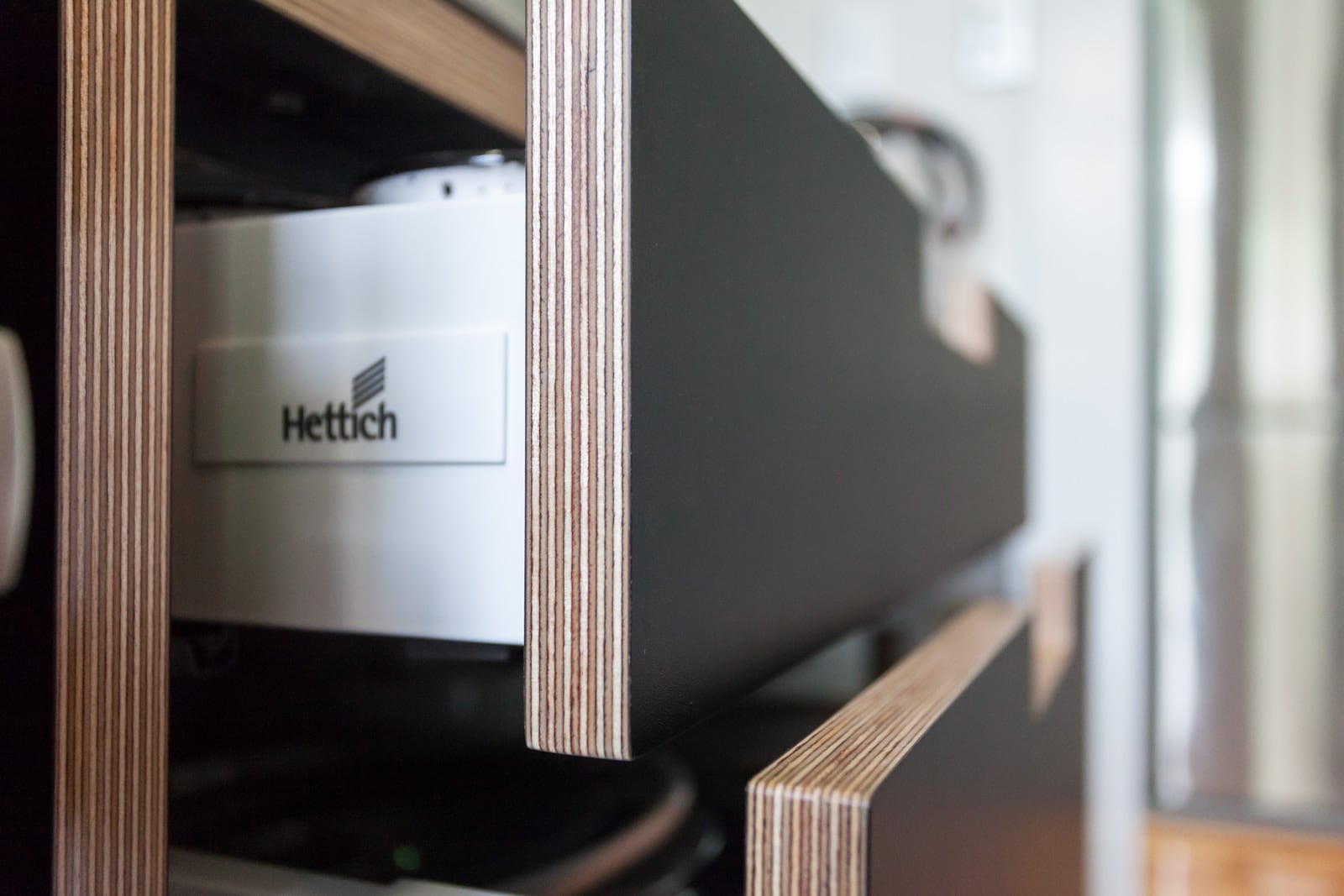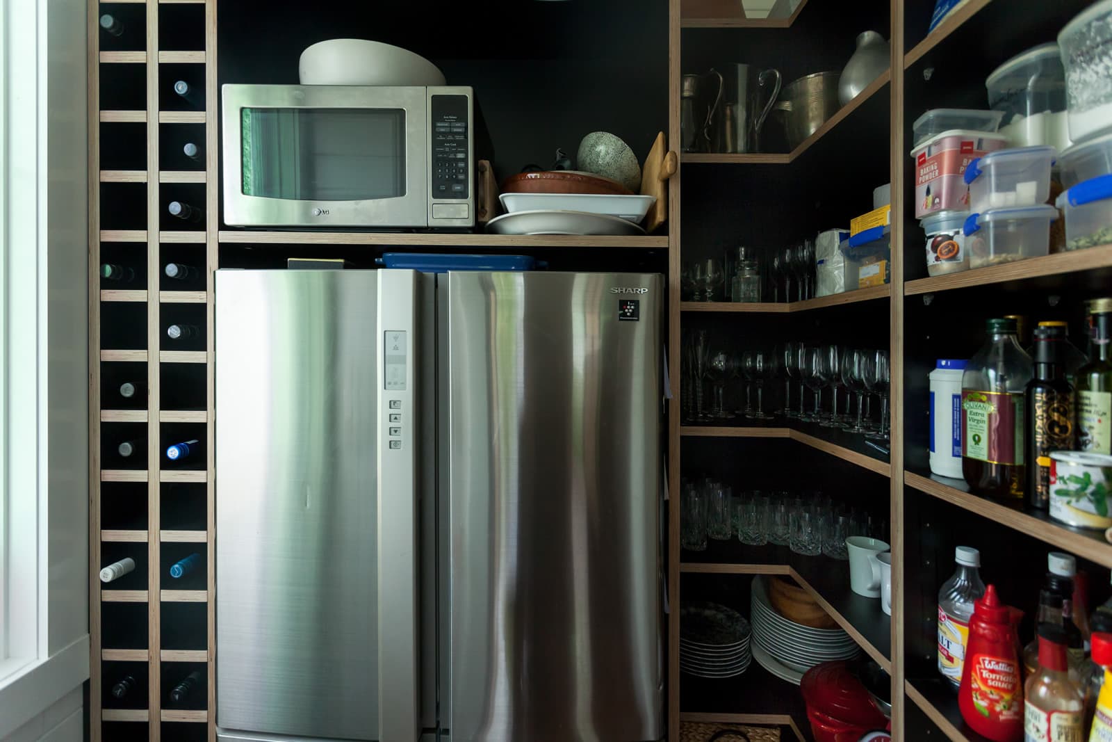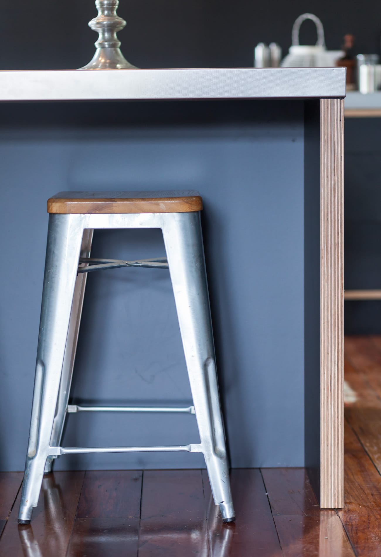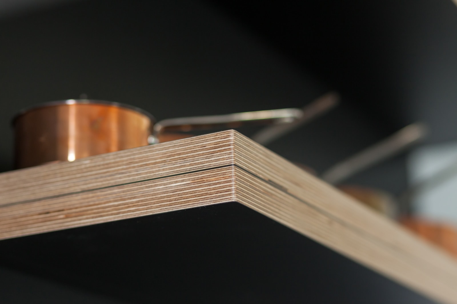 Simple birch plywood shelving really pops against the painted black splashback allowing Marcus to display some of his beautiful prized possessions.