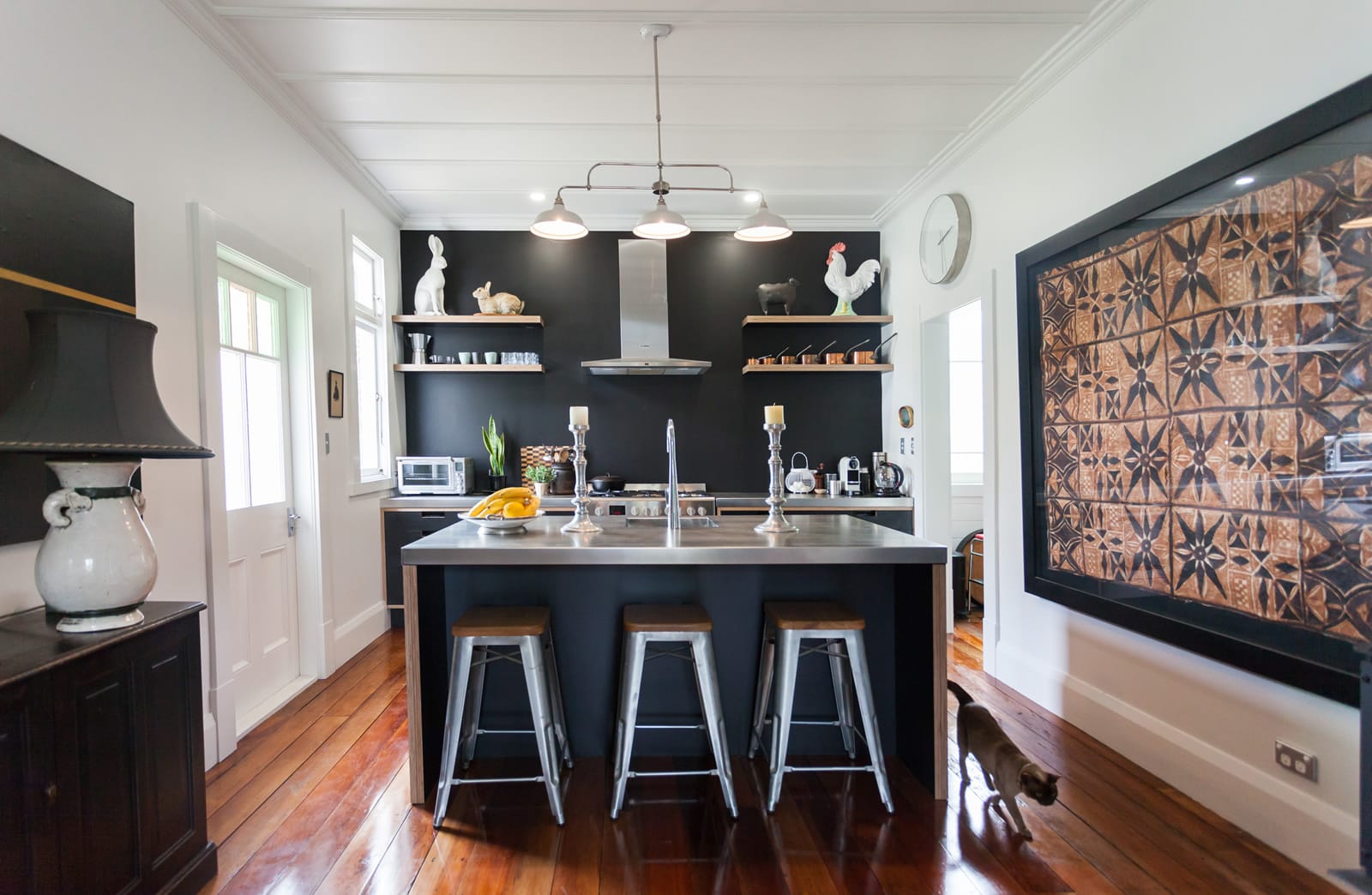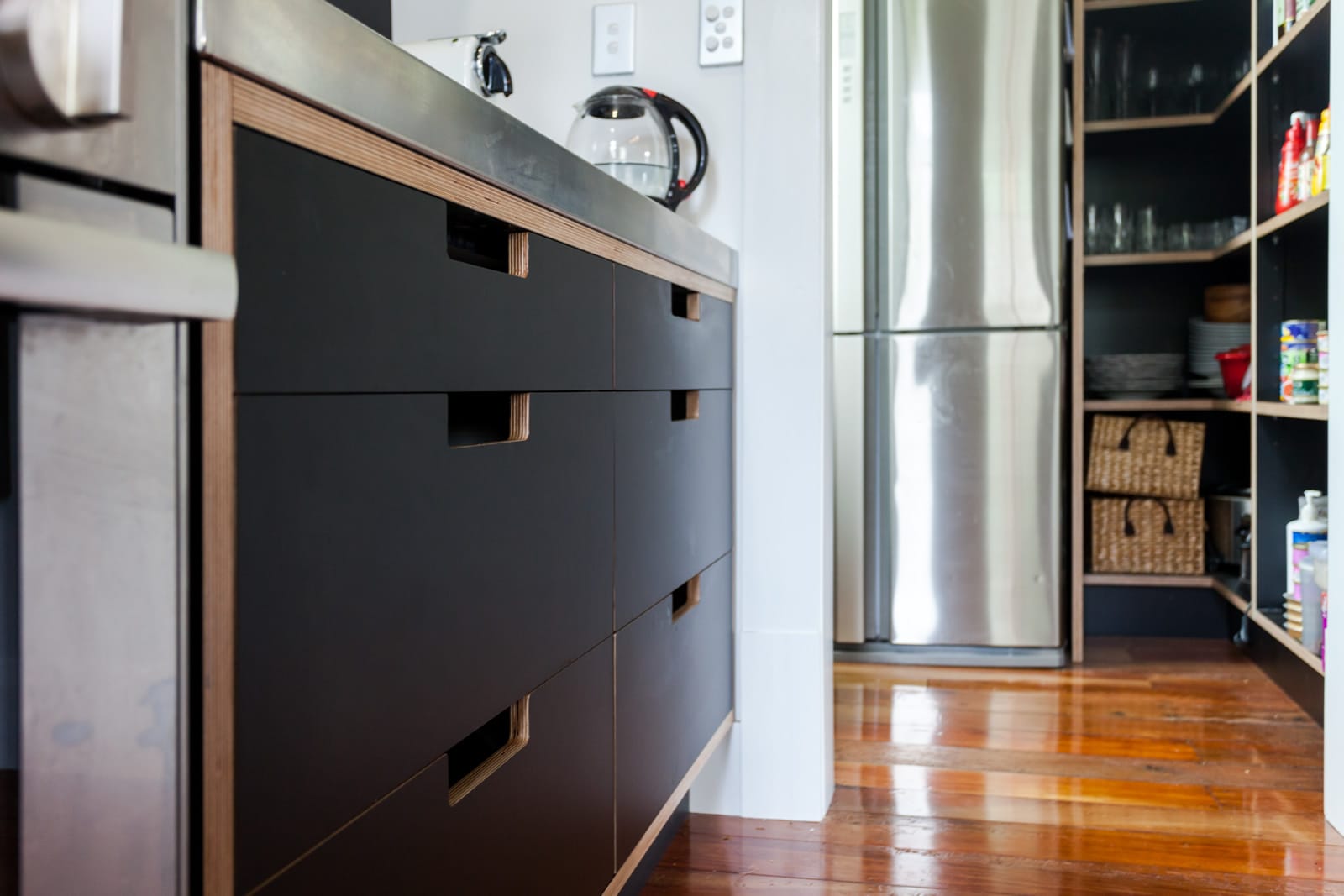 The central island bench top is from stainless steel, with under-counter cabinetry in black Futura HPL. Polished wooden floors retain the Villa aesthetic in this contemporary design.